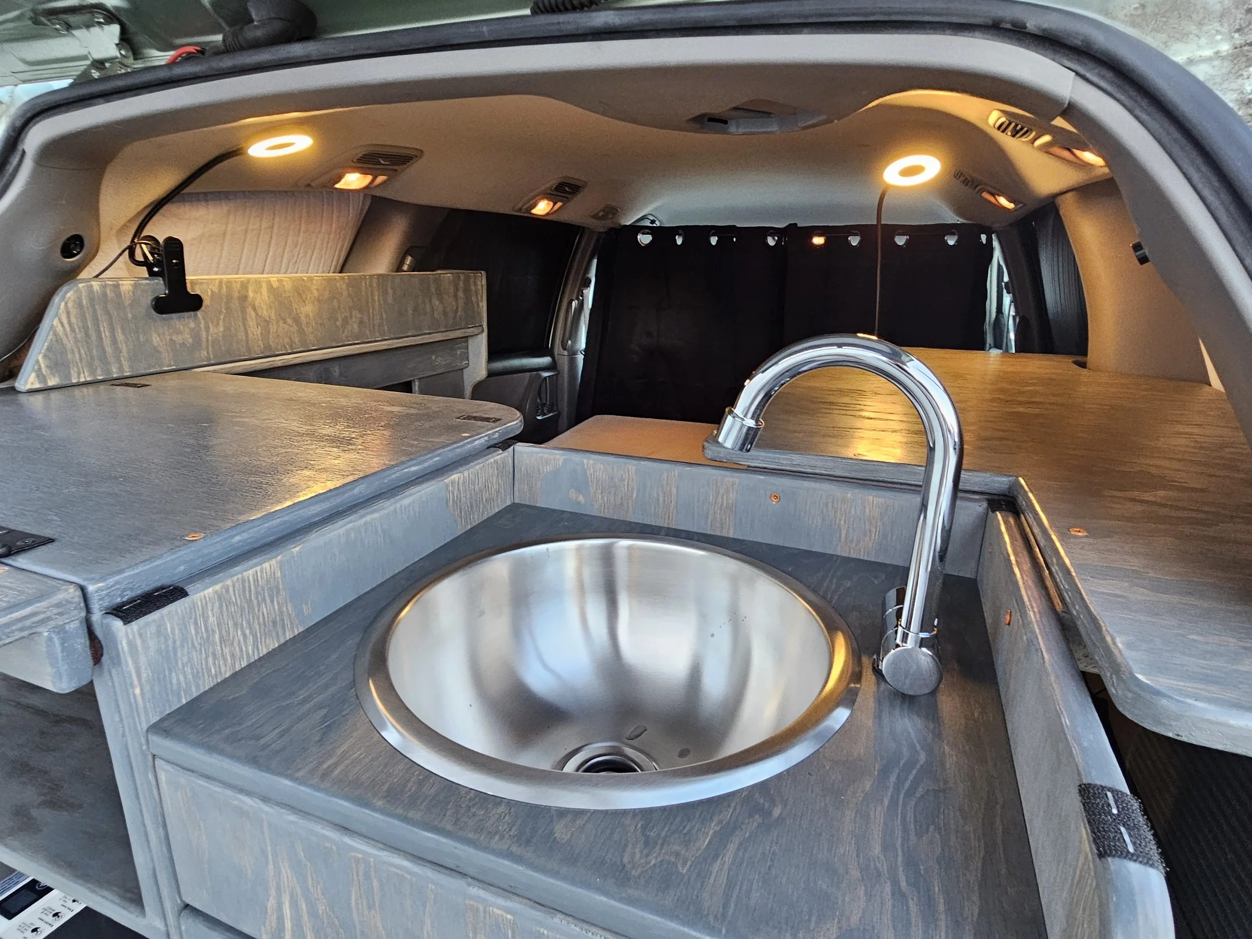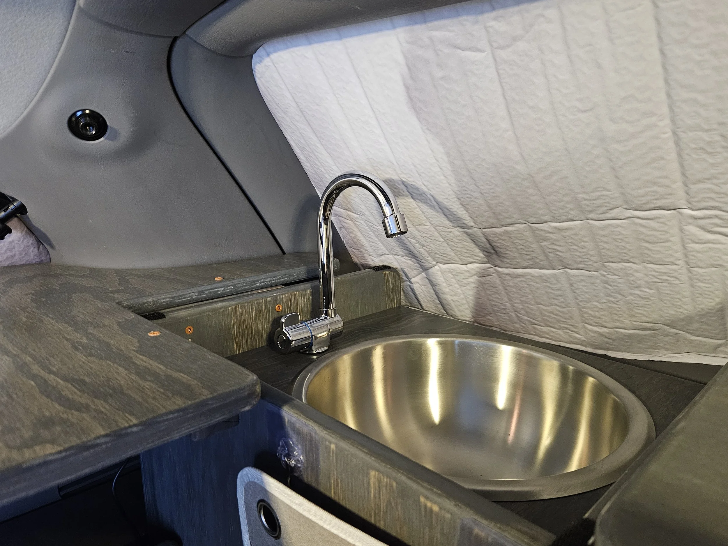 Indoor / Outdoor Automated Kitchen Sink Cabinet Featuring An Adjustable Stainless Steel Faucet, Sink Bowl, 12V Water Pump And (2) 5 Gallon Water Containers For Fresh And Gray Water disposal
